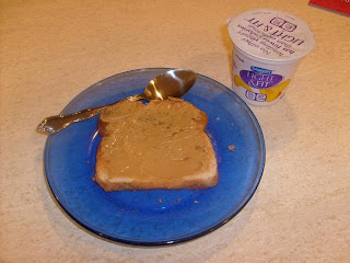 Peanut butter on wheat toast and light peach yogurt.