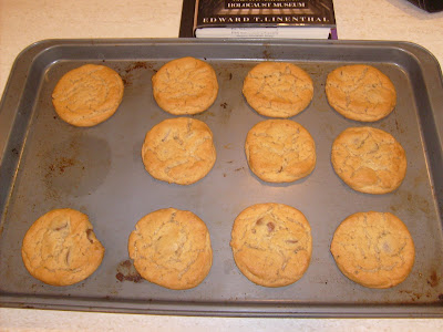 While the oven was warm from the pizza, I figured I may as well bake some cookies. They're peanut butter cookies with peanut butter cup chunks...very good. I ate one and a half.